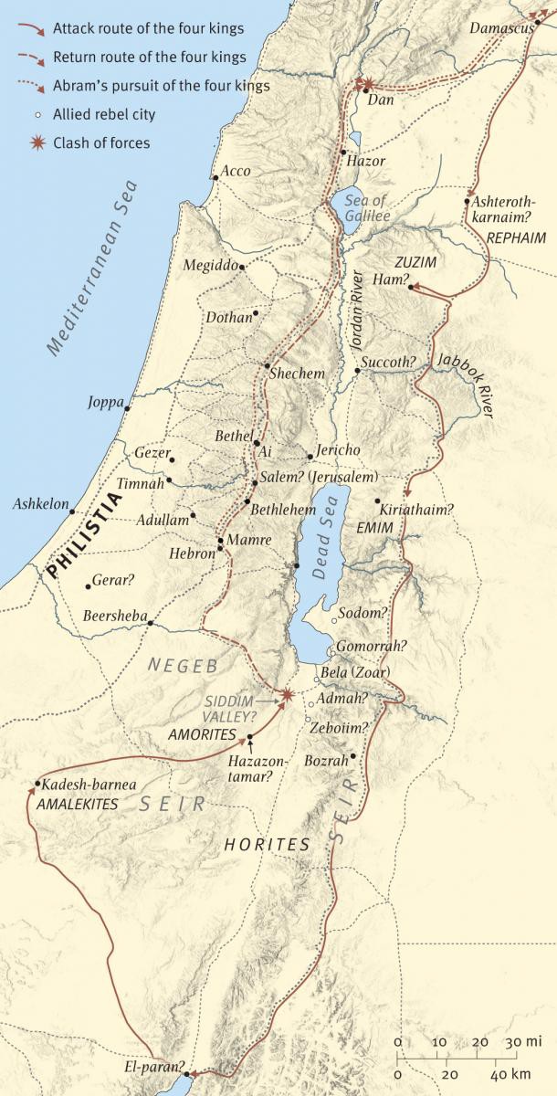 Abram shows both his bravery in rescuing Lot and his ongoing desire to honor God. Following his victory, Abram is led in worship by the priest/king Melchizedek (“king of righteousness”), who then receives Abram’s thanksgiving offering. Melchizedek is recognized in the New Testament as a type of Christ.